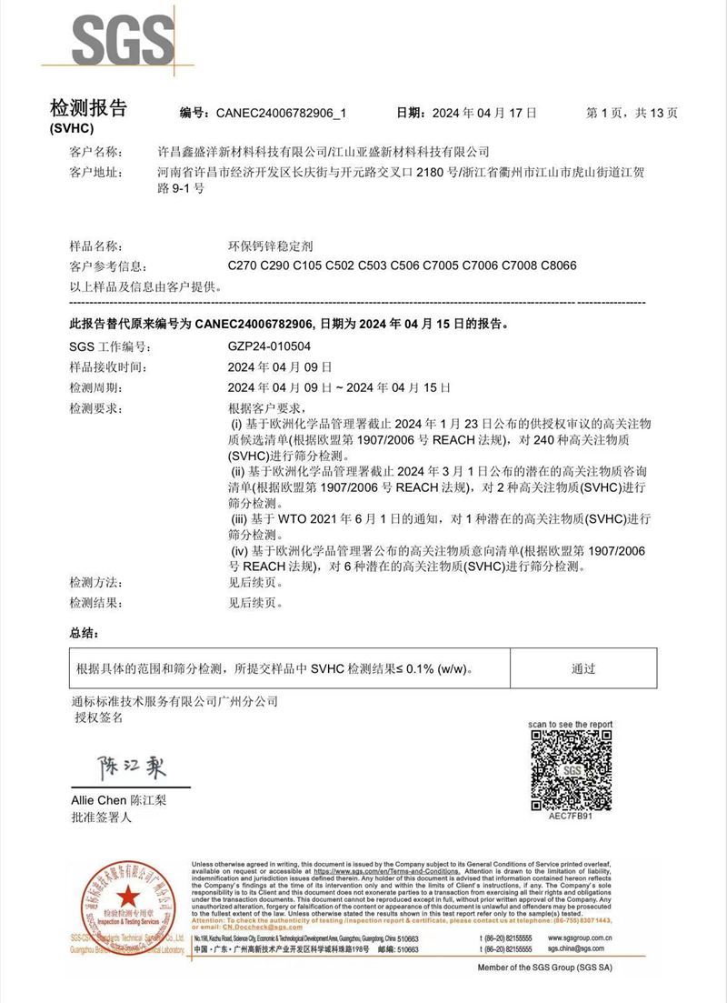公司擁有江山亞盛新材料科技有限公司和許昌鑫盛洋新材料科技有限公司兩個生產基地,秉承“客戶至上、質量、服務至上”的理念,贏得了廣大客戶的一致好評。公司是一家專注于PVC高端穩定劑研發、制造和銷售的綜合性工廠,提供全方位的技術服務。目前公司擁有PVC電線電纜、PVC玩具注塑成型、PVC硬管、管件、型材、發泡制品、PVC鞋材、透明制品等環保穩定劑,可滿足市場上大多數PVC制品的使用。 公司現有員工80余人,專業研發人員6人,PVC環保穩定劑自動化生產線4條,生產能力5萬噸/年。 25年的技術研發經驗, 專業的研發設備,完善的質量體系,熱忱的服務為您提供更好的產品和服務。